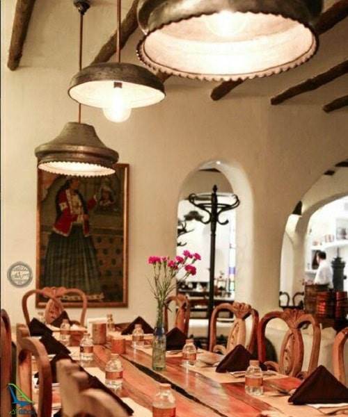 وقتی از درب ساده رستوران داخل می شوید، در حیاط حوض آبی به رنگ فیروزه ای مشاهده می کنید که جلوه زیبایی به محیط بخشیده است که درون آن را با گل های زیبا پر کرده اند. همچنین در سمت راست یک نانوایی سنی کوچک وجود دارد که در آن به پخت نان های سنتی می پردازند، این نان ها در کنار پیش غذا و خوراک های سفارش داده شده در اختیار مشتریان قرار می گیرد. ورودی رستوران دارای درب چوبی و کوچکی است که از آن طریق وارد فضای متفاوت داخلی می شوید. فضای داخلی رستوران به سبک دوران صفویه طراحی شده و دارای جذابیت های بصری زیادی می باشد؛ تلویزیون قدیمی و کوچک، لوسترهای خاص، پنجره های رنگارنگ، میز و صندلی های چوبی زیبا، تفنگ های دیواری، فضاهای حجره ای خانوادگی، صندلی های لهستانی، اتوی ذغالی و دیگر تزئیناتی که در جای جای رستوران قرار گرفته گردشگران تور تهران را به وجد می آورد. در واقع گلدان های موجود در رستوران شیشه های دوغ آبعلی بوده و لوسترها نیز طاس های بسیار قدیمی می باشند.